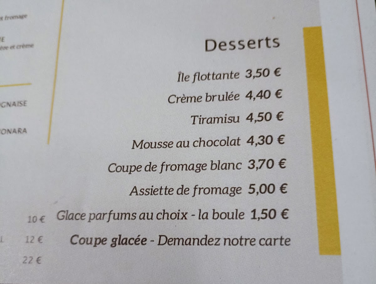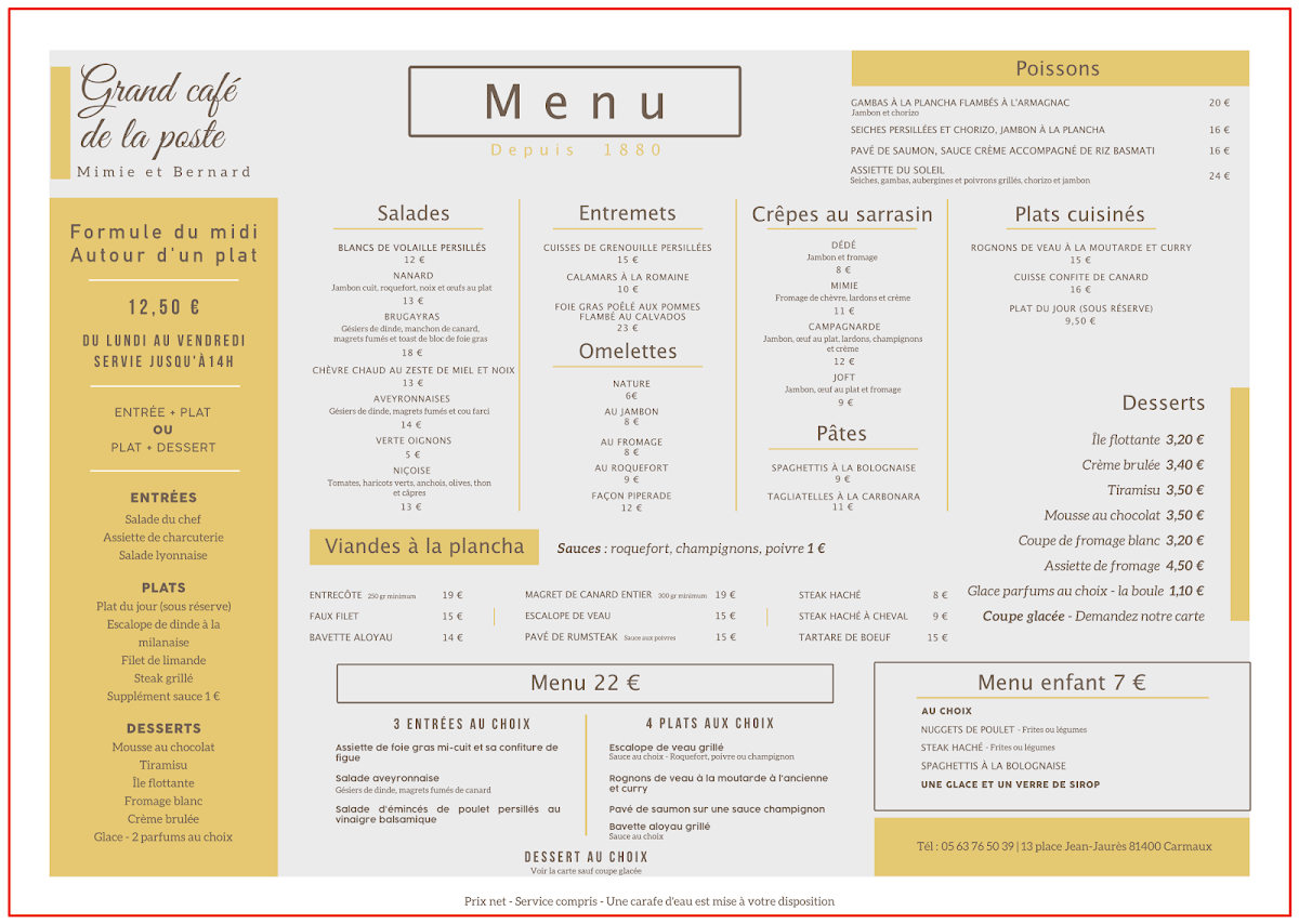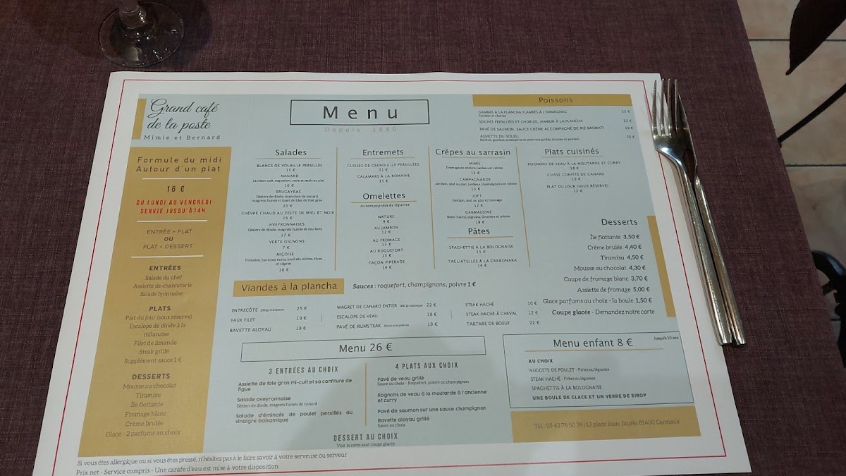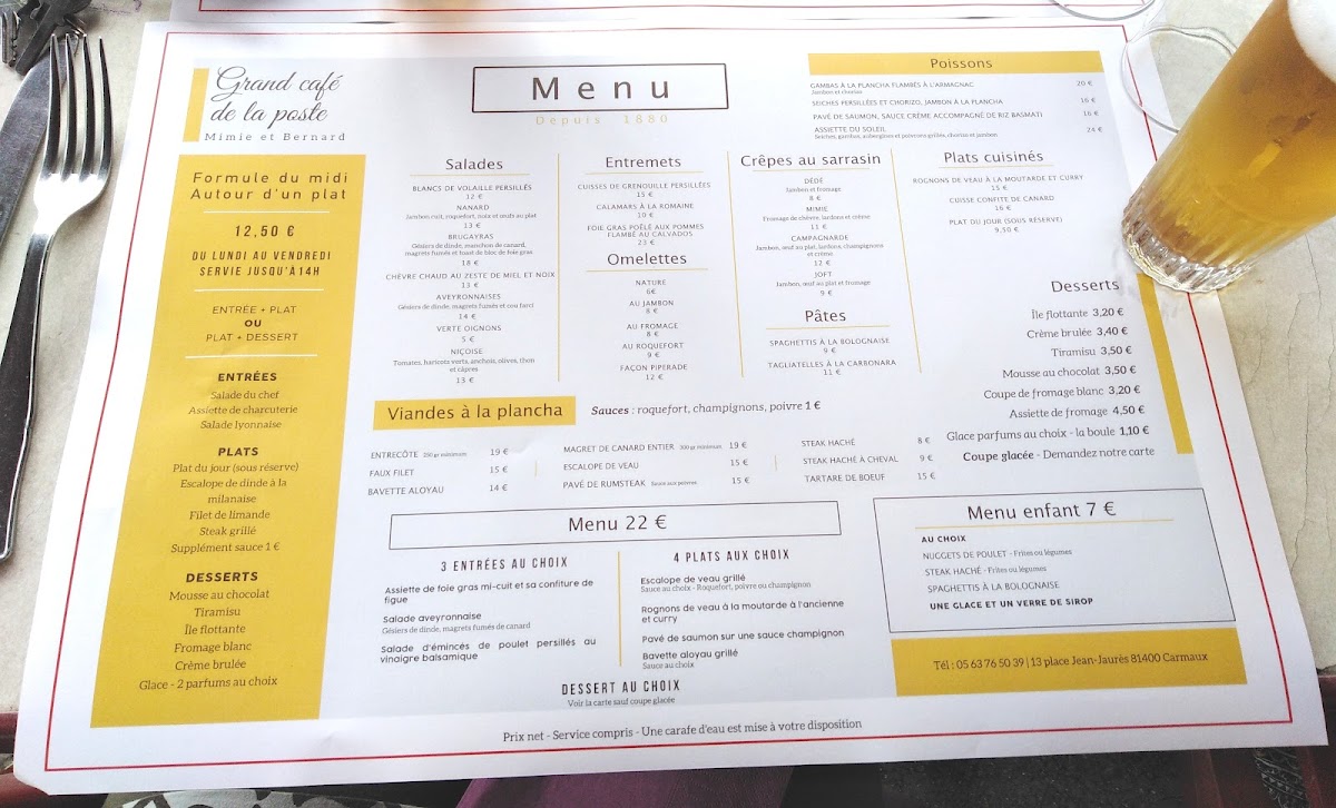 At Grand Café De La Poste, the menu showcases a delightful blend of French and international flavors, offering something for every taste. The standout dishes include the classic Tête de Veau, an indulgent veal dish that’s perfectly tender and flavorful. For those craving something lighter, the Fish and Chips is a crispy, satisfying choice, while the Nuggets-frites provides a hearty comfort meal, ideal for both kids and adults. The Steak Tartare de Bœuf, prepared with raw beef and complemented by fresh seasonings, is a bold yet refined option for steak lovers. Seafood enthusiasts will appreciate the Seiches À la Plancha, a well-cooked dish full of flavor. For dessert, the Crème Brûlée offers a rich, velvety treat with a satisfying caramelized top. Among the lighter meals, the Escalope de Dinde À la Milanaise Accompagnée de Frites provides a crispy and savory bite, while the Salade Brugayras is fresh and satisfying, ideal for a healthier choice. The Cafés Gourmand is a perfect way to end your meal with a selection of small desserts and coffee. The Salade de Chèvre Chaud Zeste de Miel Et Noix combines the sweetness of honey with the tanginess of goat cheese, a refreshing salad option. If you're after something simple but satisfying, the Salade de Pâtes Au Thon is a deliciously light pasta salad with tuna. For a more robust dish, the Steak Tartare Et Salade Nanard Sans Jambon Pour Moi offers a unique twist with a tangy side salad. The Seiches Persillées Haricots Verts Sans Jambon is another seafood-based option that’s light yet bursting with flavor. The Filet de Limande Frites is a classic French choice, combining crispy fried fish with golden fries. Each dish is thoughtfully prepared, offering a perfect blend of flavors, textures, and satisfying portions for a truly enjoyable dining experience.